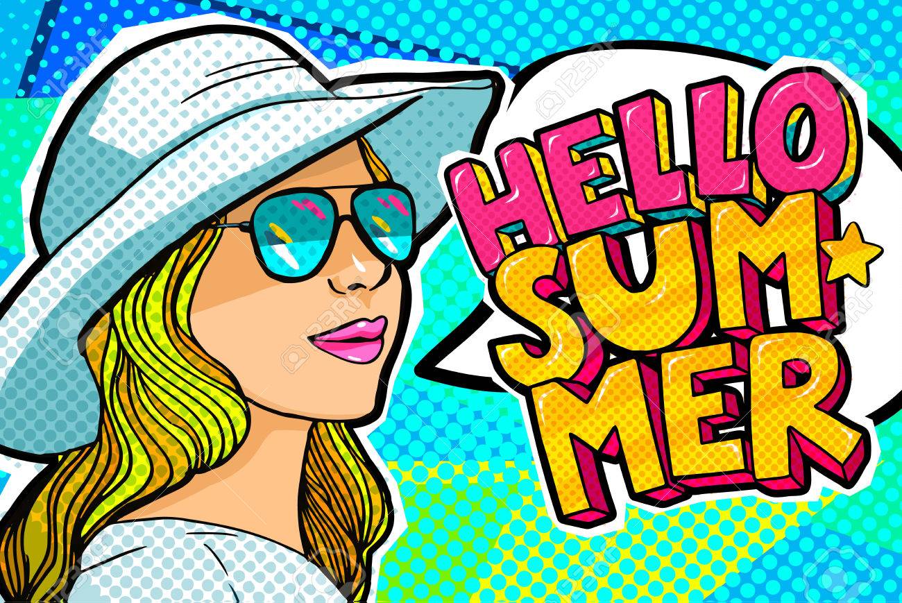 Hello Summer Message and beautiful young woman in a hat in retro pop art style. Vector illustration.